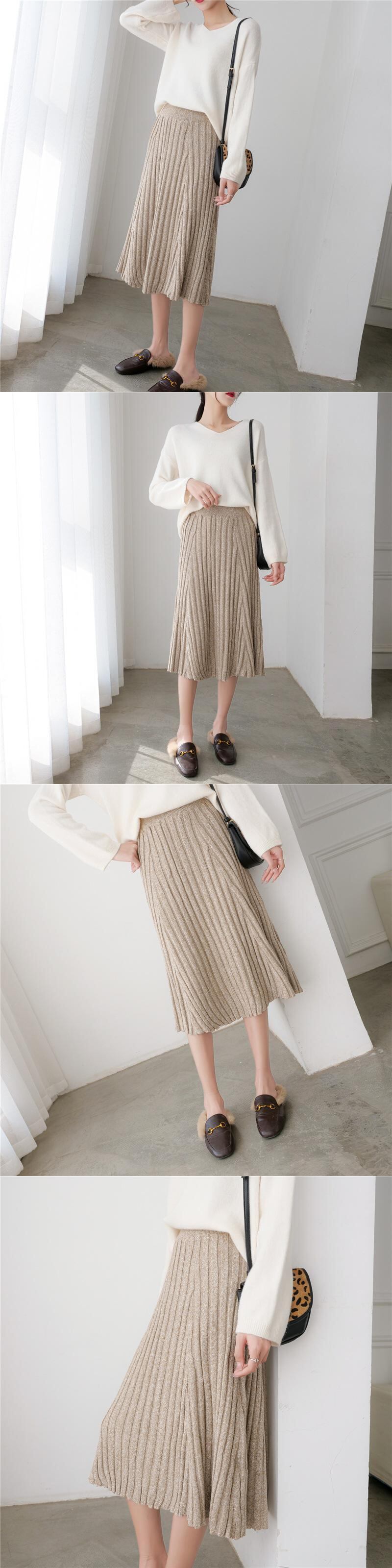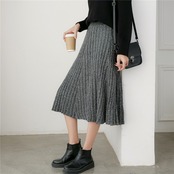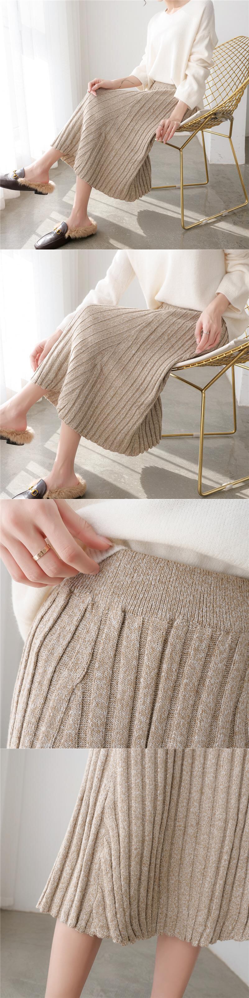 オータムウィンターハイウェストニットAラインスカート プリーツミディレディース 秋物 冬物 普寧33222846033